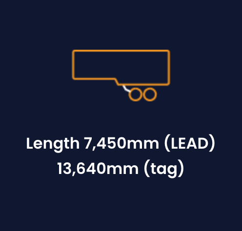 Overall Length: 7,495mm (lead) 13,640mm (tag) | Overall height: 4,300mm | Overall width: 2,490mm | Aperture Length: 7,200mm (lead) / 13,340mm (tag) | Aperture height: 2,725mm | Internal Width: 2,400mm